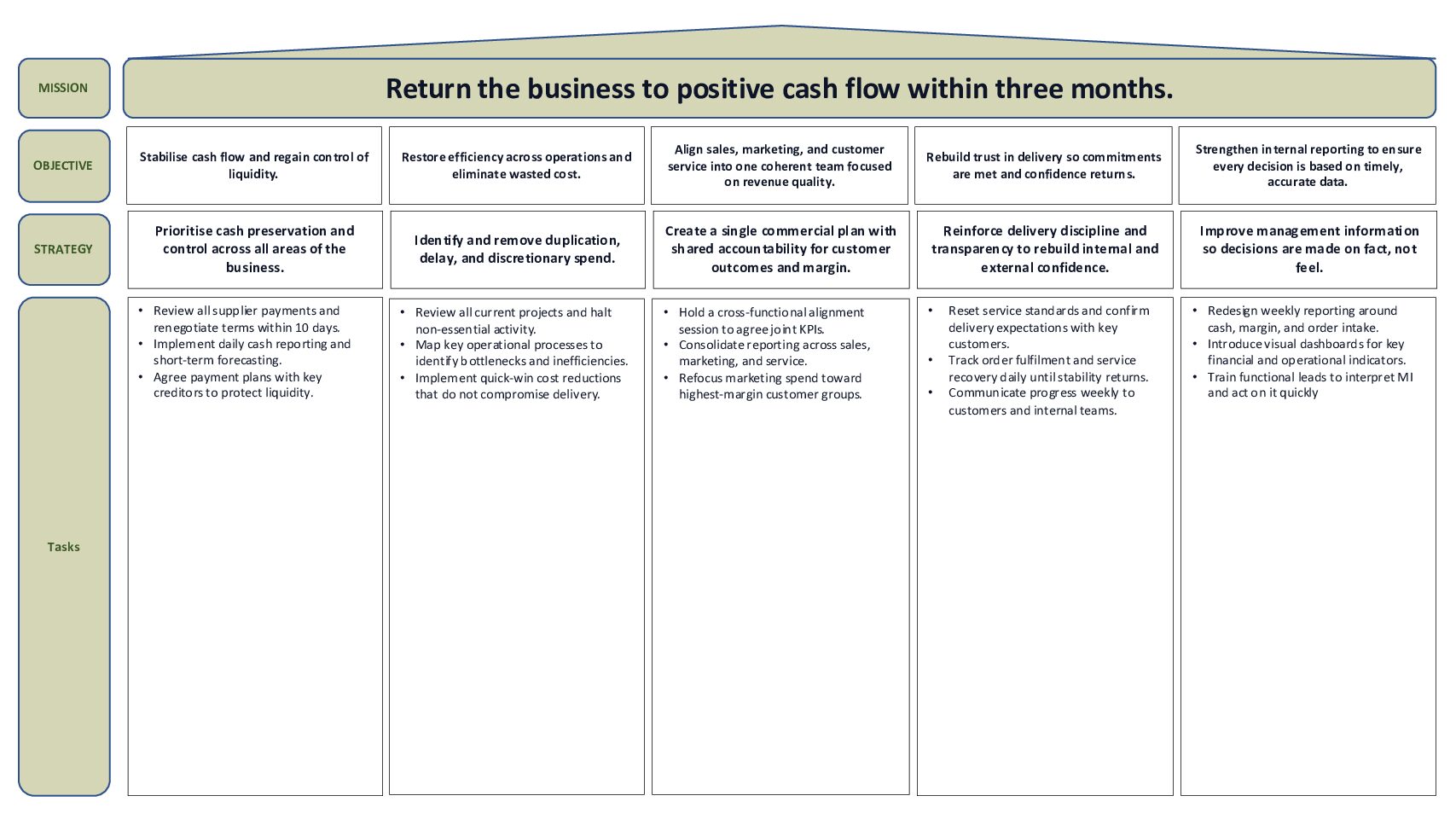 Your strategy might start with stabilising cash flow, then rebuilding operational discipline, followed by re-energising sales and customer confidence. Each step must have a clear purpose and ownership.